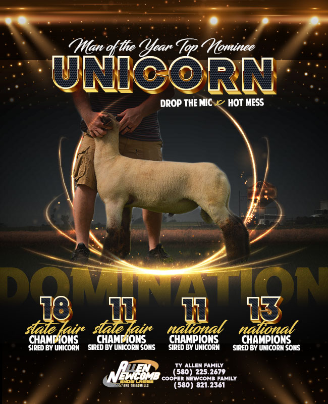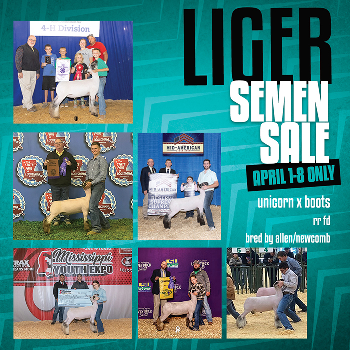 While we never got around to formally introducing or picturing Liger before we put him to work, he was my pick of the Unicorn’s at Allen/Newcomb that spring, and we were stoked to get him bought off their buck sale. In just his first lamb crop (2022) he sired the Reserve Grand at South Dakota State Fair, the Champion Commercial Ewe at LSU Spring Show, Reserve Hamp – LSU Spring Show, Champion Prospect – State Fair of LA, Reserve Grand – Mid-American, 4th Overall – MS Youth Expo and a Class Winner at Arizona Nationals. This year’s crop has some standouts as well, and we’re excited for their future.