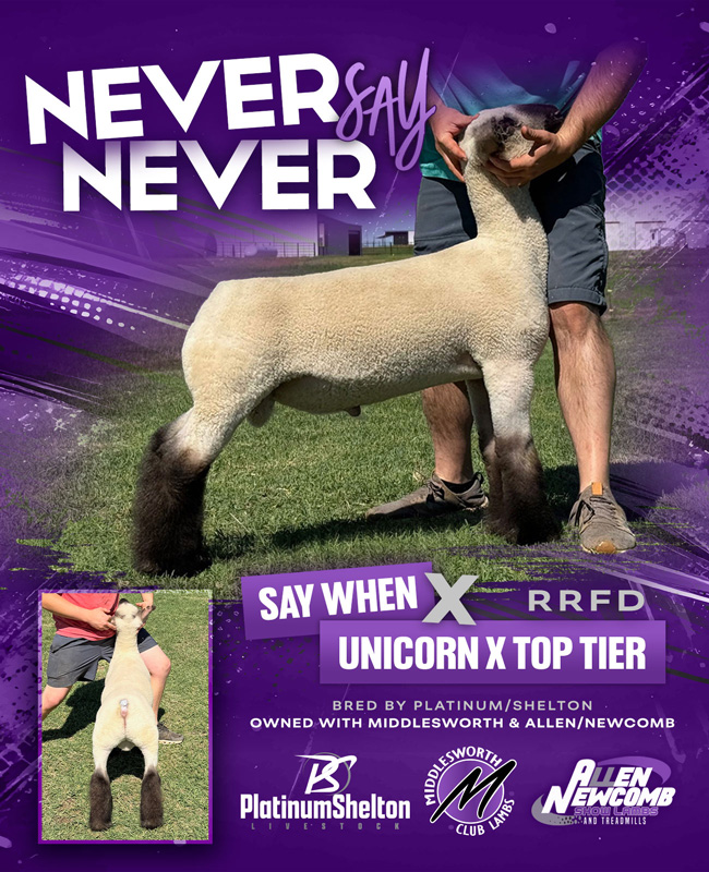 A good friend of mine came thru a few weeks prior to the Texas sales to look at babies, and then continued to spend the better part of 24 hours convincing me that this sheep had the pieces I had been looking for all spring, and also had the pedigree to boot. Needless to say, sometimes we all need a little PERSUASION to push us to make those big decisions on big time sheep.